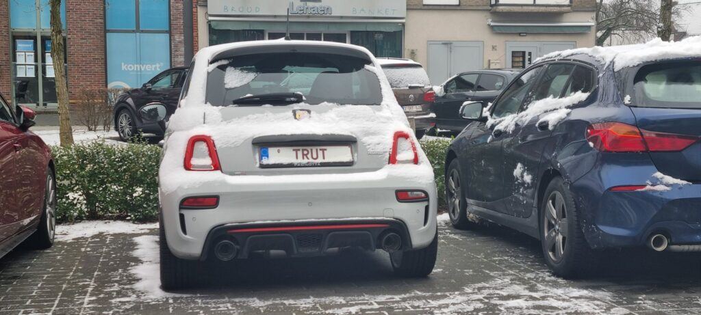 De nummerplaat werd gespot in Limburg, waar een Abarth 500 – de sportieve versie van de Fiat 500 – rondrijdt met een wel héél aparte gepersonaliseerde nummerplaat. Er prijken slechts vier letters op: “TRUT”. Kort maar krachtig, zeg maar. Al moest de eigenaar of eigenares er wel 1.000 euro voor ophoesten.