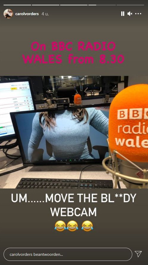 Vorderman presenteerde vanmorgen het radioprogramma ‘Final Score’ op BBC Radio Wales. Het programma was ook live te volgen via de webcam, maar dat liep niet meteen van een leien dakje. De camera focuste immers op haar borsten, wat uiteraard niet de bedoeling was. “Euh, kan de webcam aangepast worden?”, knipoogde ze op Instagram.