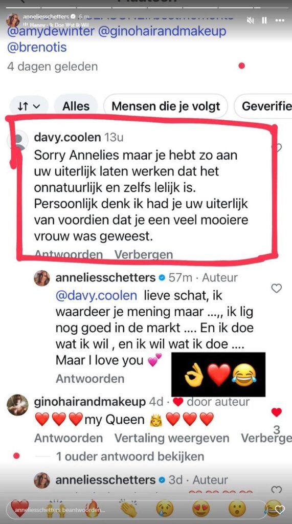 Onlangs kreeg ze op social media commentaar van een volger, die zijn ongezouten mening gaf over haar uiterlijk. “Sorry, Annelies, maar je hebt zo aan je uiterlijk laten werken dat het onnatuurlijk en zelfs lelijk is. Persoonlijk denk ik: had je je uiterlijk van voordien, dat je een veel mooiere vrouw was geweest”, klinkt het.