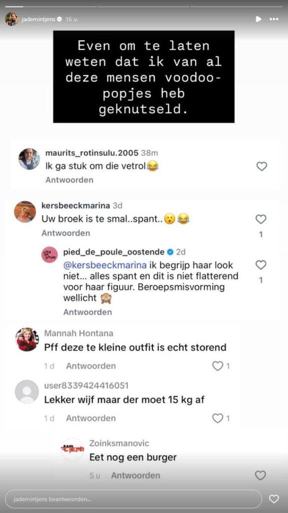 Jade liet het commentaar niet aan haar hart komen, maar negeerde het evenmin. Ze deelde op Instagram een screenshot van de bewuste commentaren en gaf haar mening over de kritiek. “Even om te laten weten dat ik van al deze mensen voodoopopjes heb geknutseld”, knipoogt ze, maar daarom niet minder gemeend.