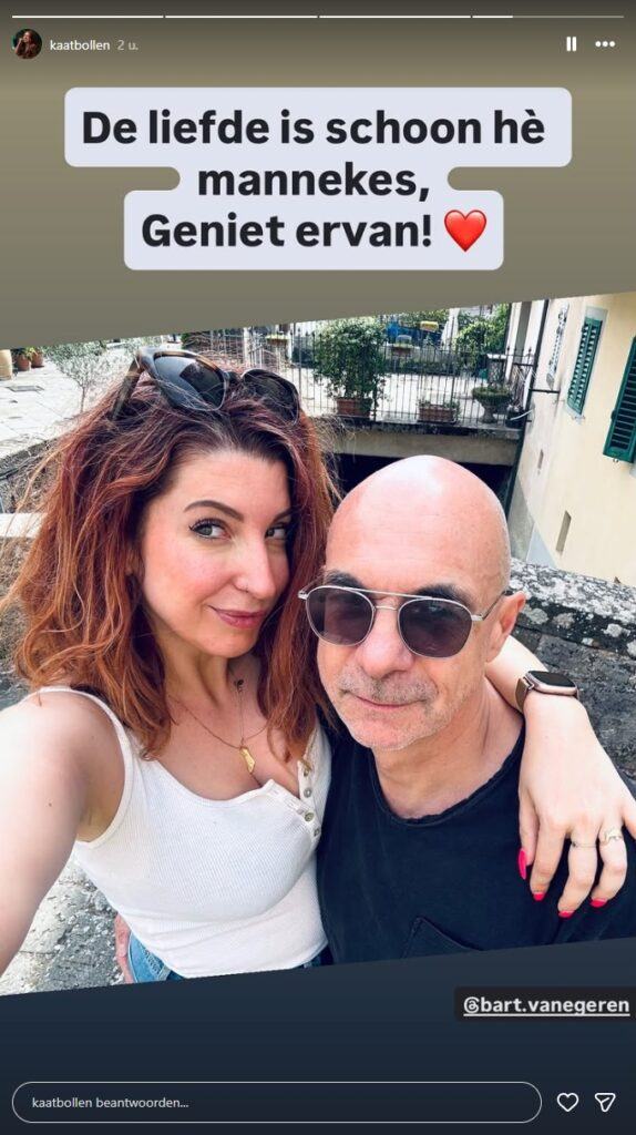 Heuglijk nieuws in BV-land: Kaat Bollen heeft haar prins op het witte paard gevonden. De gelukkige is niemand minder dan Bart Vanegeren, de hoofdredacteur van Humo. Met zijn 58 lentes is hij 18 jaar ouder dan de 40-jarige seksuologe. Kaat deelde een kiekje van hen samen op Instagram. “De liefde is schoon hè, mannekes. Geniet ervan!”, glundert ze.