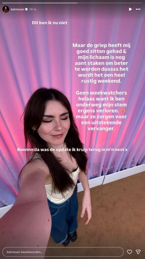 “Dit ben ik nu niet”, steekt ze van wal op Instagram, verwijzend naar een foto waarop ze een fijne avond beleeft. “Maar de griep heeft me goed te pakken gehad en mijn lichaam is nog aan het staken om beter te worden, dus het wordt een heel rustig weekend. Geen Weekwatchers helaas, want ik ben onderweg mijn stem ergens verloren. Maar ze zorgen voor een uitstekende vervanger”, besluit ze.