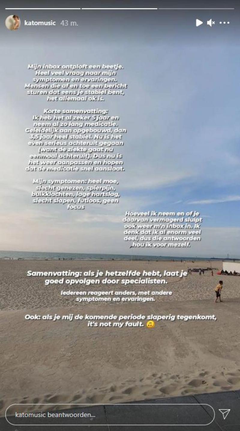 De laatste tijd merkte de 29-jarige zangeres echter dat de ziekte erger werd, dus probeert ze een nieuwe behandeling uit. «Ik heb het al zeker 5 jaar en neem al zo lang medicatie. Geleidelijk aan opgebouwd, dan 3,5 jaar heel stabiel. Nu is het even serieus achteruit gegaan (want de ziekte gaat nu eenmaal achteruit). Dus nu is het weer aanpassen en hopen dat de medicatie snel aanslaat. Mijn symptomen: heel moe, slecht genezen, spierpijn, buikklachten, lage hartslag, slecht slapen, futloos, geen focus. Als je hetzelfde hebt, laat je goed opvolgen door specialisten. Iedereen reageert anders, met andere symptomen en ervaringen», schrijft ze op Instagram.