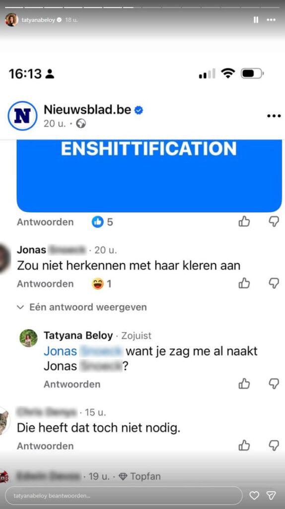Het Nieuwsblad goot haar getuigenis in een artikel en deelde het op Facebook. Er kwamen heel wat reacties op, onder meer van ene Jonas. “Ik zou haar niet herkennen met haar kleren aan”, schreef hij. Tatyana liet die opmerking niet zomaar passeren. “Want je zag me al naakt, Jonas?”, repliceerde ze. Vervolgens deelde ze er een screenshot van op haar Instagram. “Ik reageer even op Jonas… Iets wat ik nog nooit heb gedaan: reageren op zulke gekke opmerkingen”, klinkt het.