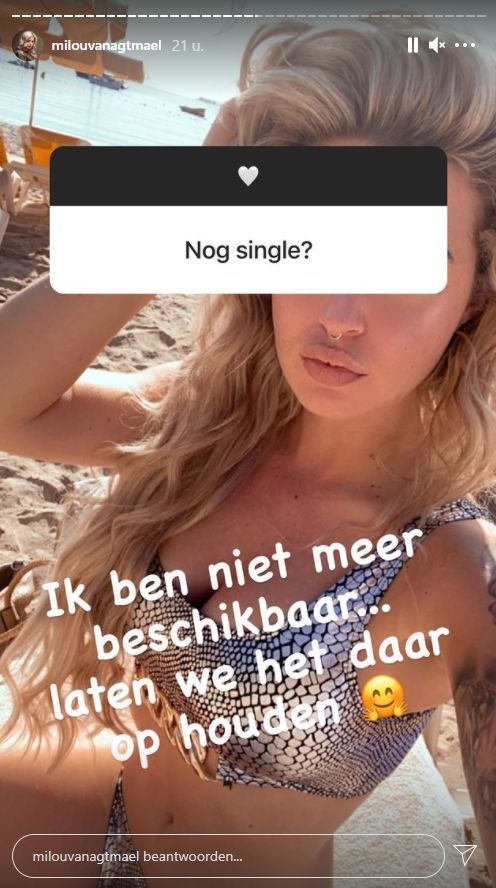 Een Instagramvolger vroeg aan Milou of ze nog single is. “Ik ben niet meer beschikbaar. Laten we het daarop houden”, knipoogde ze. Gevraagd naar de gelukkige reageerde ze als volgt: “Dat is een geheim. Het is nog te vroeg”, schreef ze.