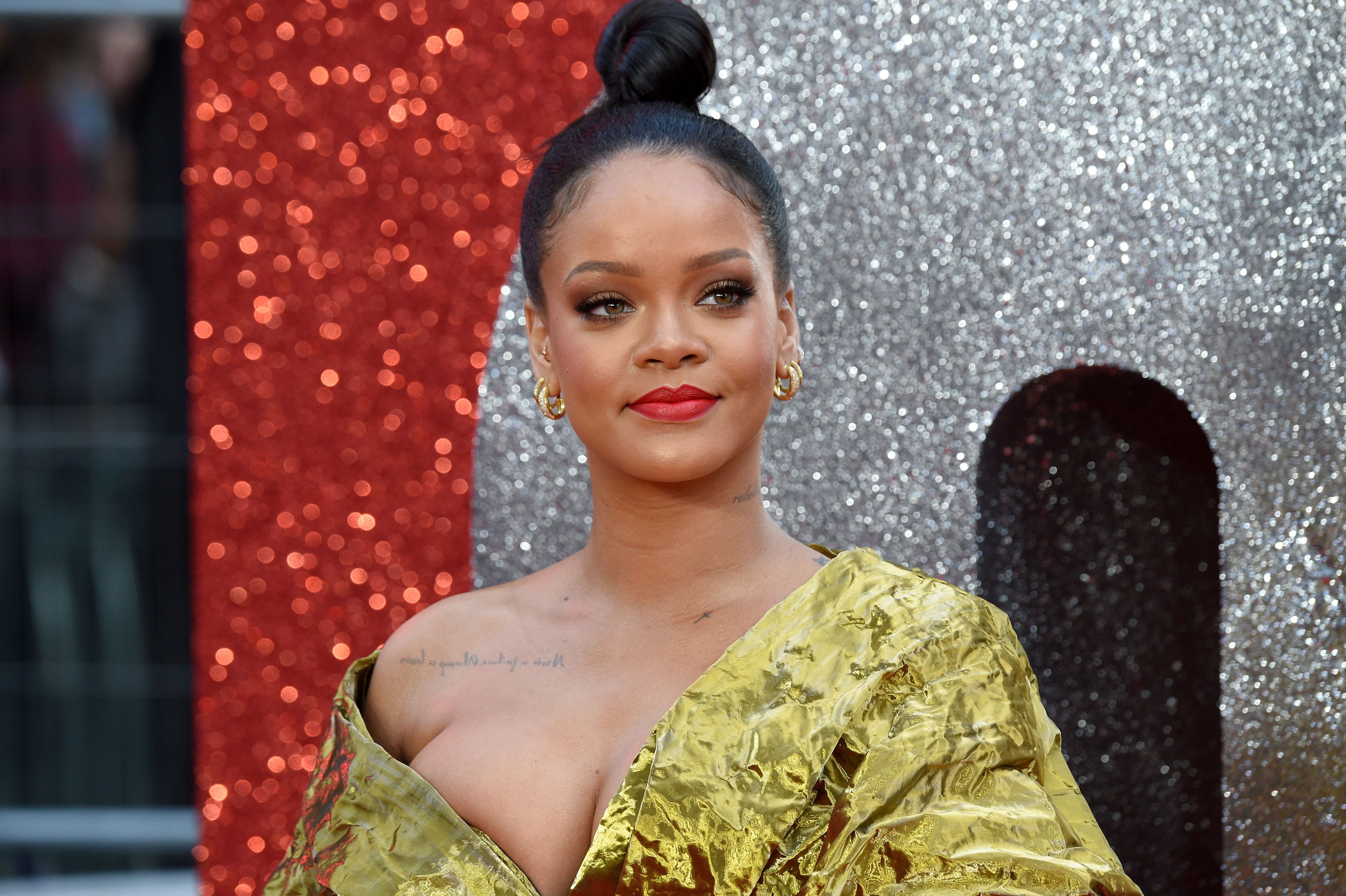 Barbadian singer and actress Rihanna poses on the carpet upon arrival to attend he European premiere of the film ” Ocean’s 8″ in London on June 13, 2018. / AFP PHOTO / Anthony HARVEY