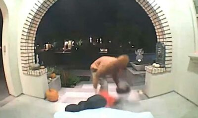 Op beelden is te zien hoe een jongeman met Halloween langs een huis gaat en niet...
