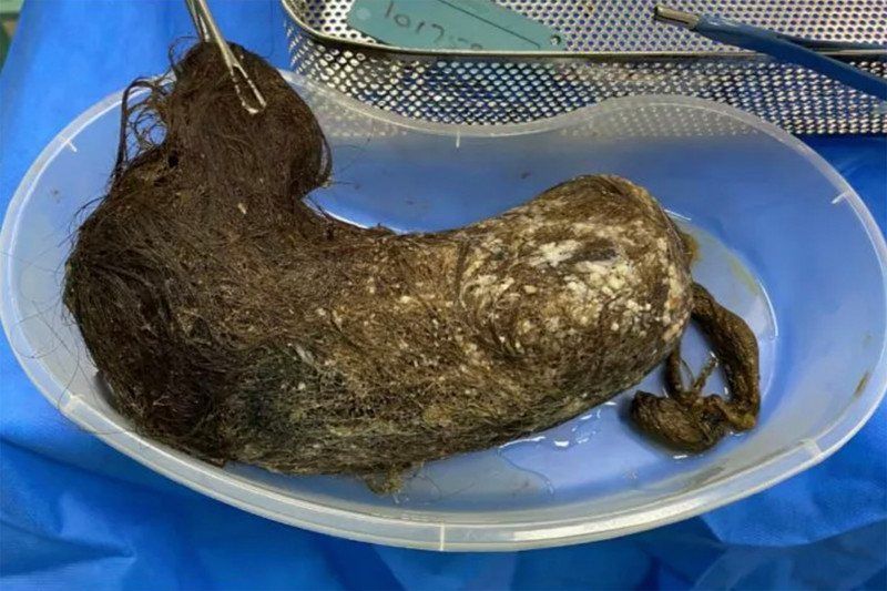 Een CT-scan wees vervolgens uit dat er zich een grote massa in haar “sterk opgezwollen maag” bevond. Bovendien was die maag ook gescheurd. De dokters besloten haar te opereren en troffen er een gigantische haarbal van meer dan 40 centimeter lang aan. De haarbal (ook wel bezoar genoemd) was zo imposant dat hij de maag volledig vulde en door de druk tevens de vorm van het orgaan had aangenomen. Hoe dat eruit ziet, bekijk je onderaan het artikel (opgelet: niet voor gevoelige kijkers).